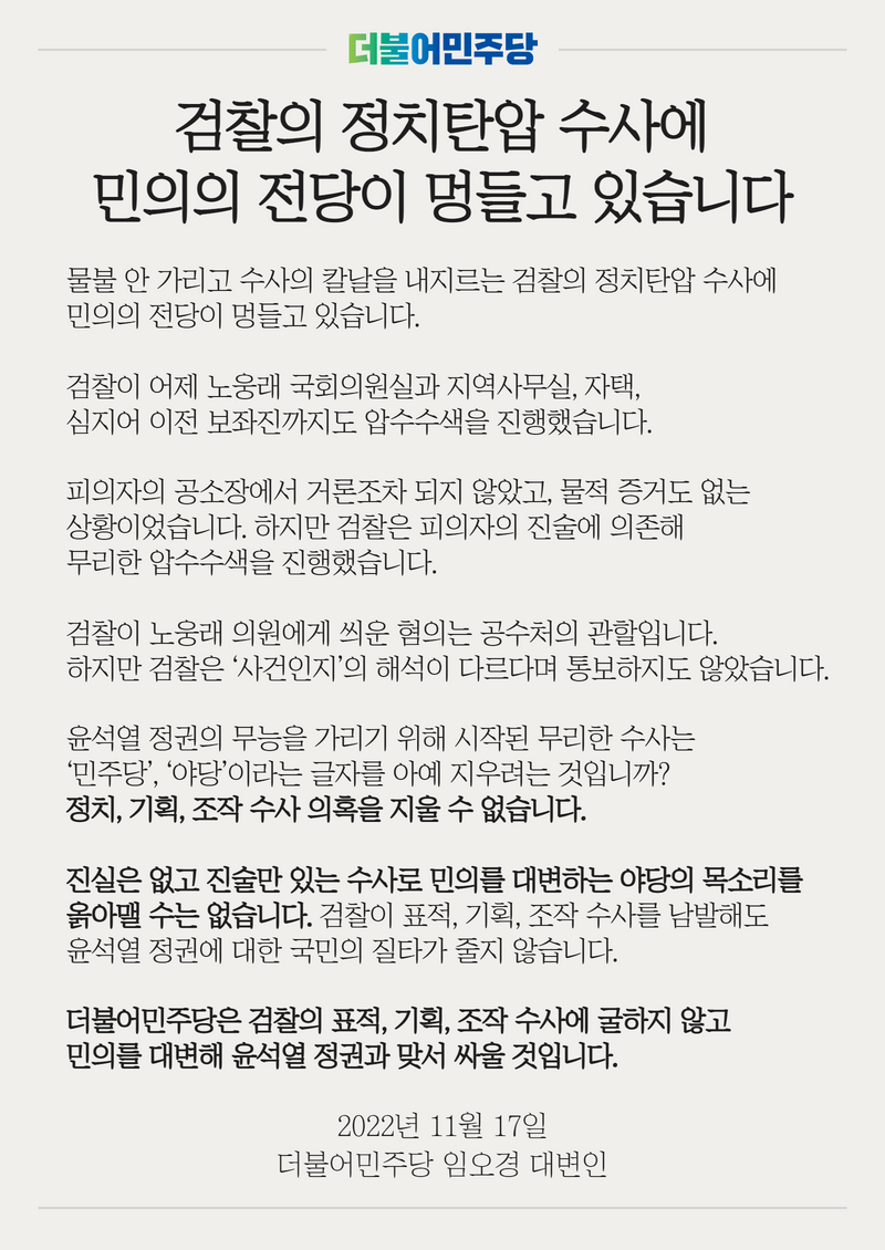 검찰의 정치탄압 수사에 민의의 전당이 멍들고 있습니다