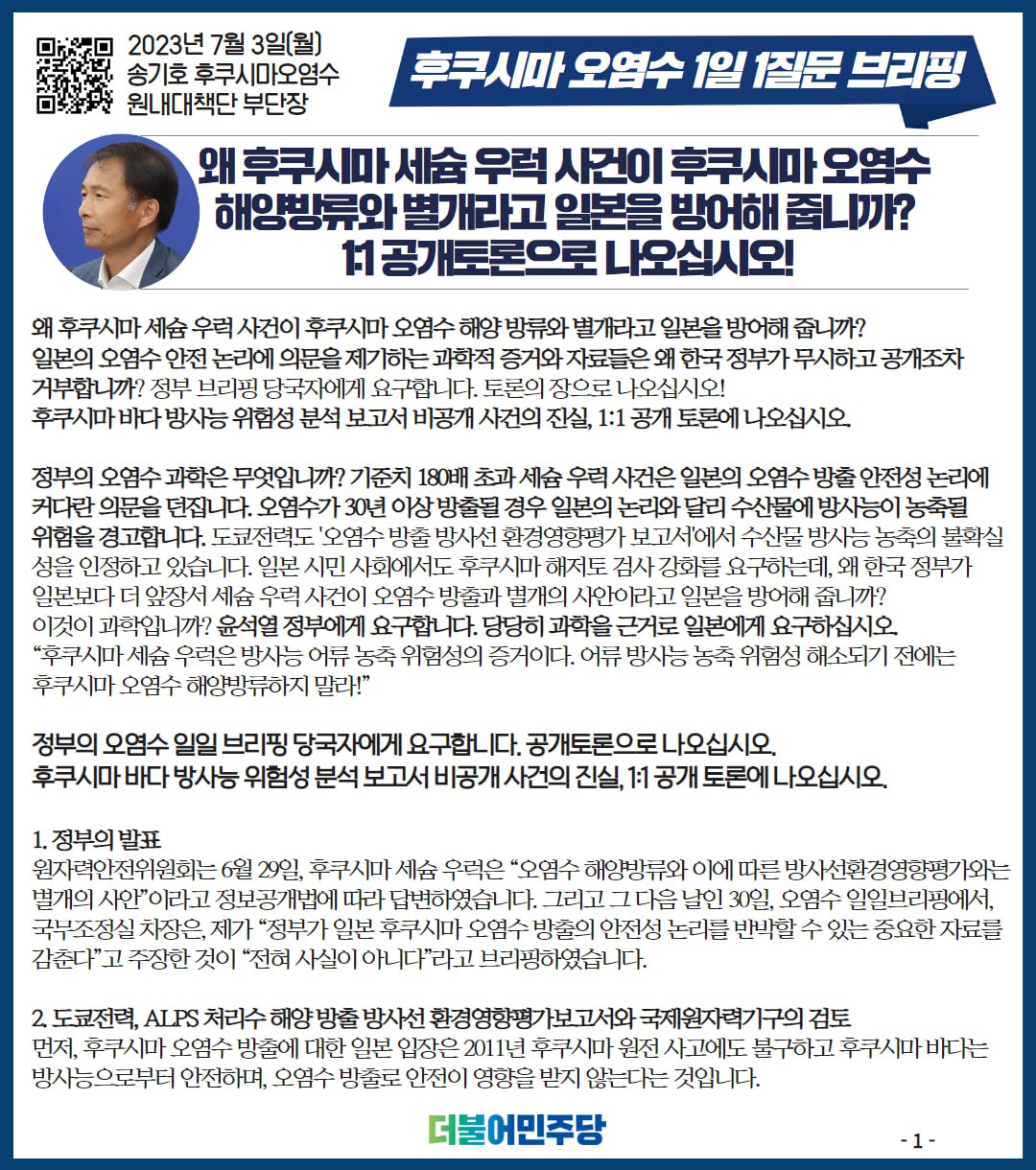 23.7.3 후쿠시마 오염수 1일 1질문 브리핑