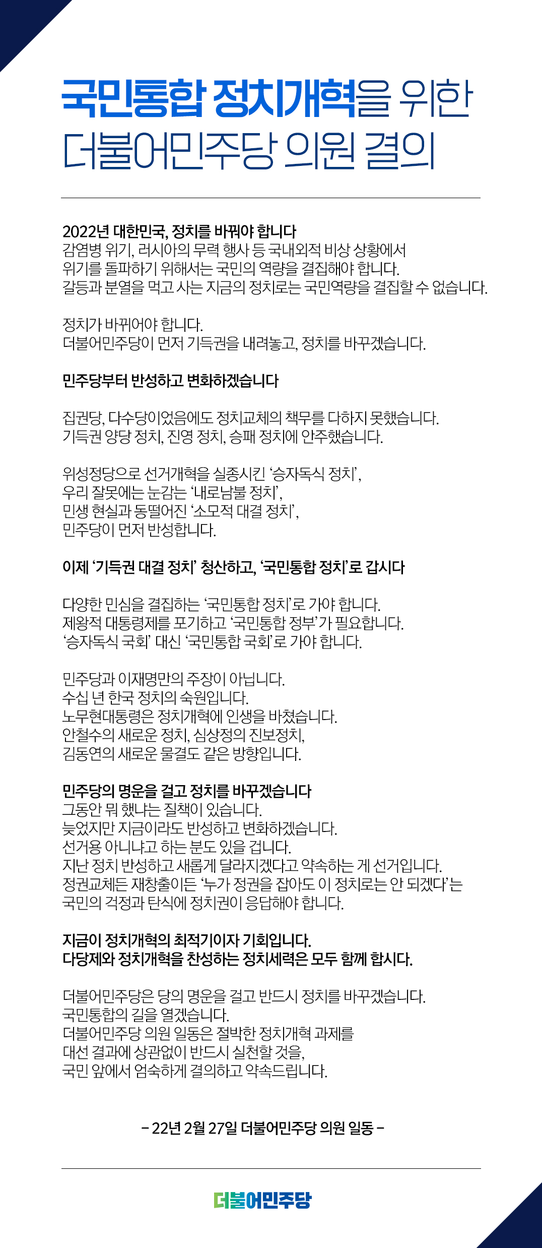 국민통합 정치개혁을 위한 더불어민주당 의원 결의