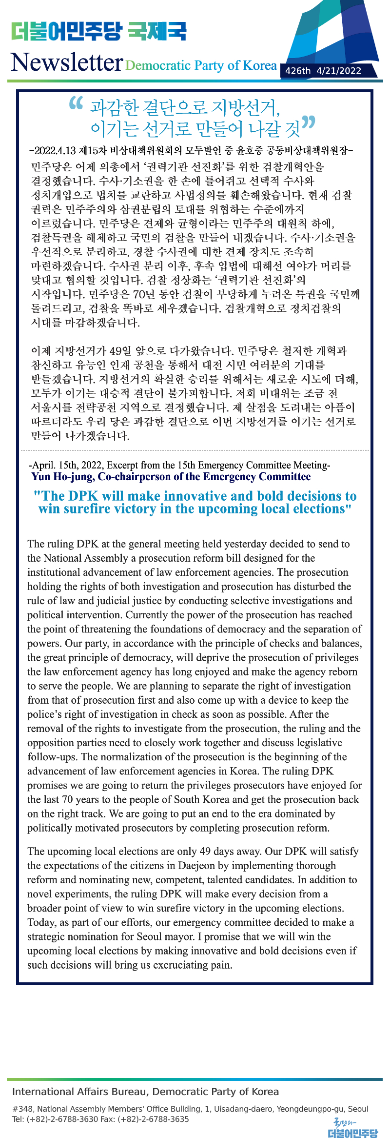 [426th Newsletter] Excerpt from the 15th Emergency Committee Meeting