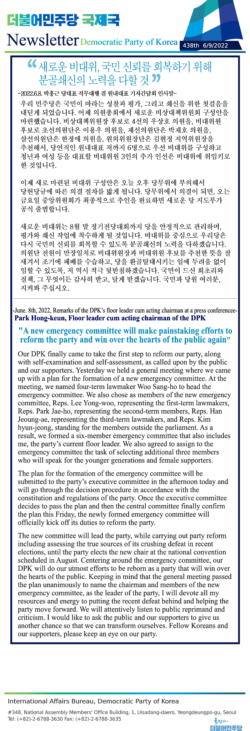 [438th Newsletter] Remarks of the DPK’s floor leader cum acting chairman at a press conference