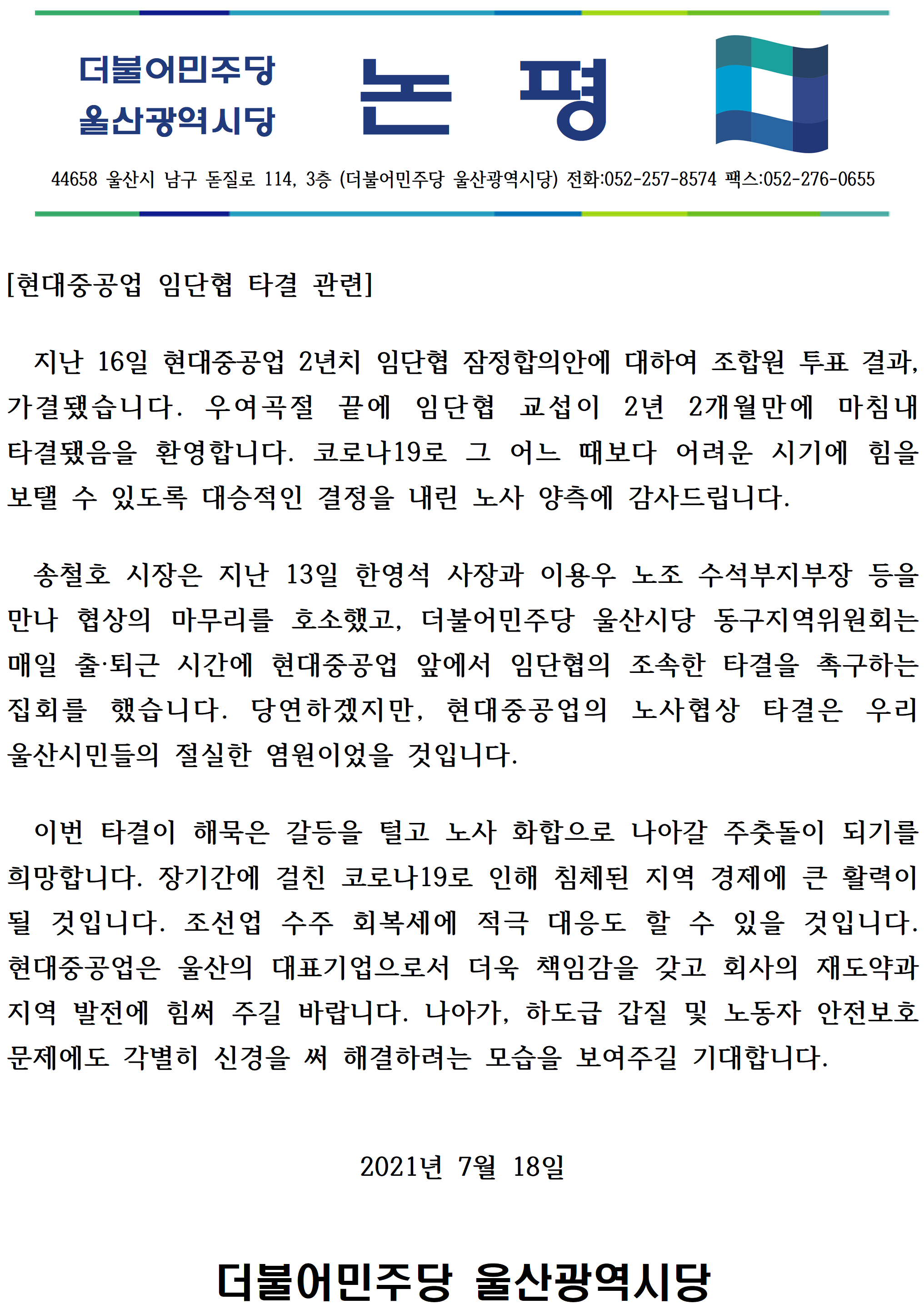 [논평] 현대중공업 임단협 타결 관련-20210718