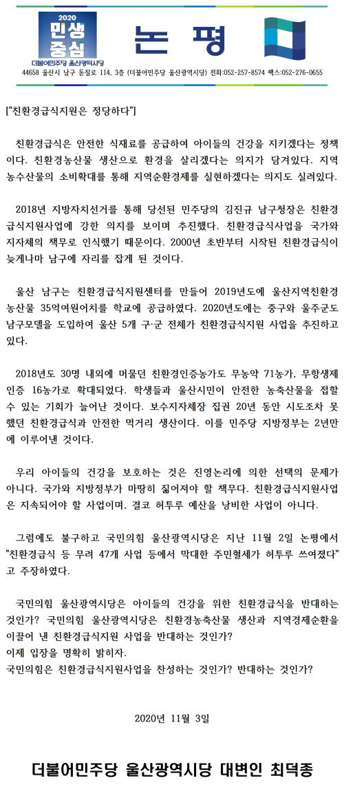 [논평]"소상공인과 더불어 잘 사는 지역사회를 만들어 나가겠습니다"-20201105