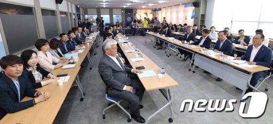 | 4일 오후 울산시 남구 더불어민주당 울산시당 민주홀에서 민선 7기 1주년 성과와 과제, 2년차 추진 방향을 주제로 '제1차 확대자치분권정책협의회'가 열리고 있다. 2019.7.4/뉴스1 © News1 윤일지 기자 |