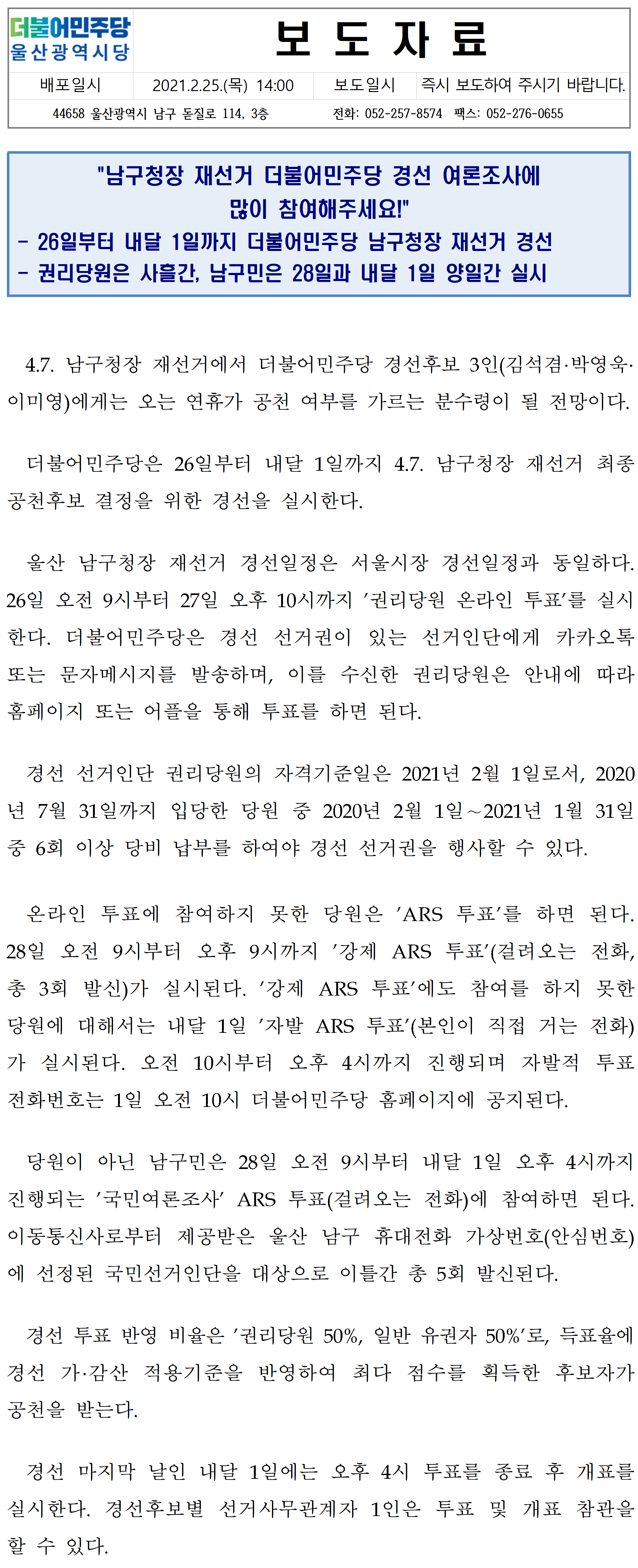 [보도자료] "남구청장 재선거 경선 여론조사에 많이 참여해주세요!"-20210225