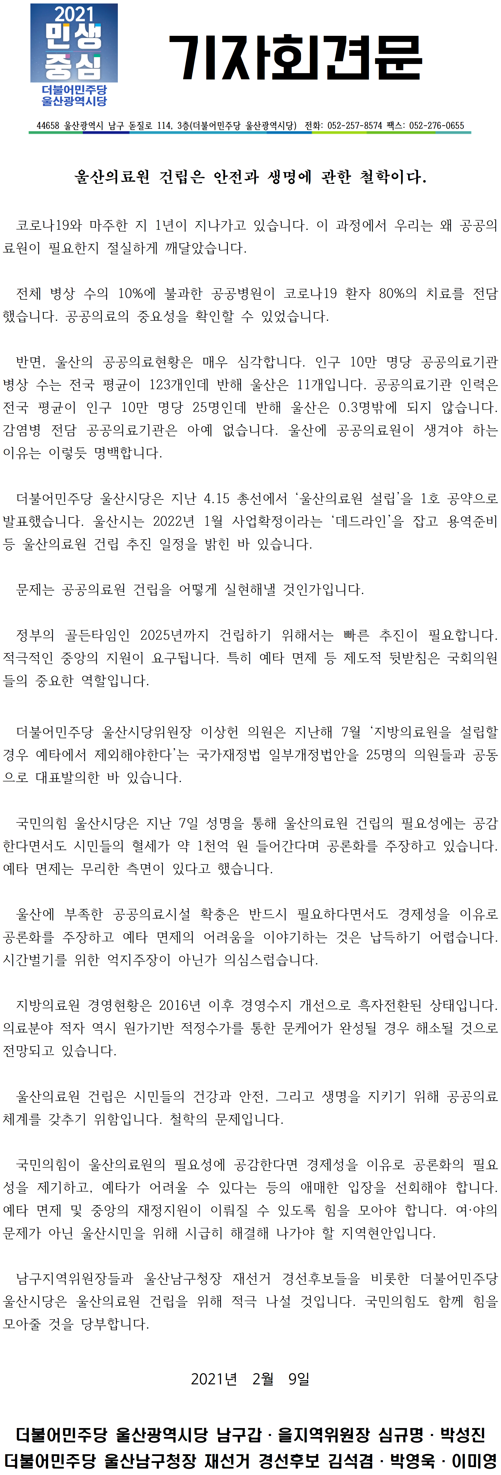 [기자회견문] "울산의료원 건립은 안전과 생명에 관한 철학이다"-20210209