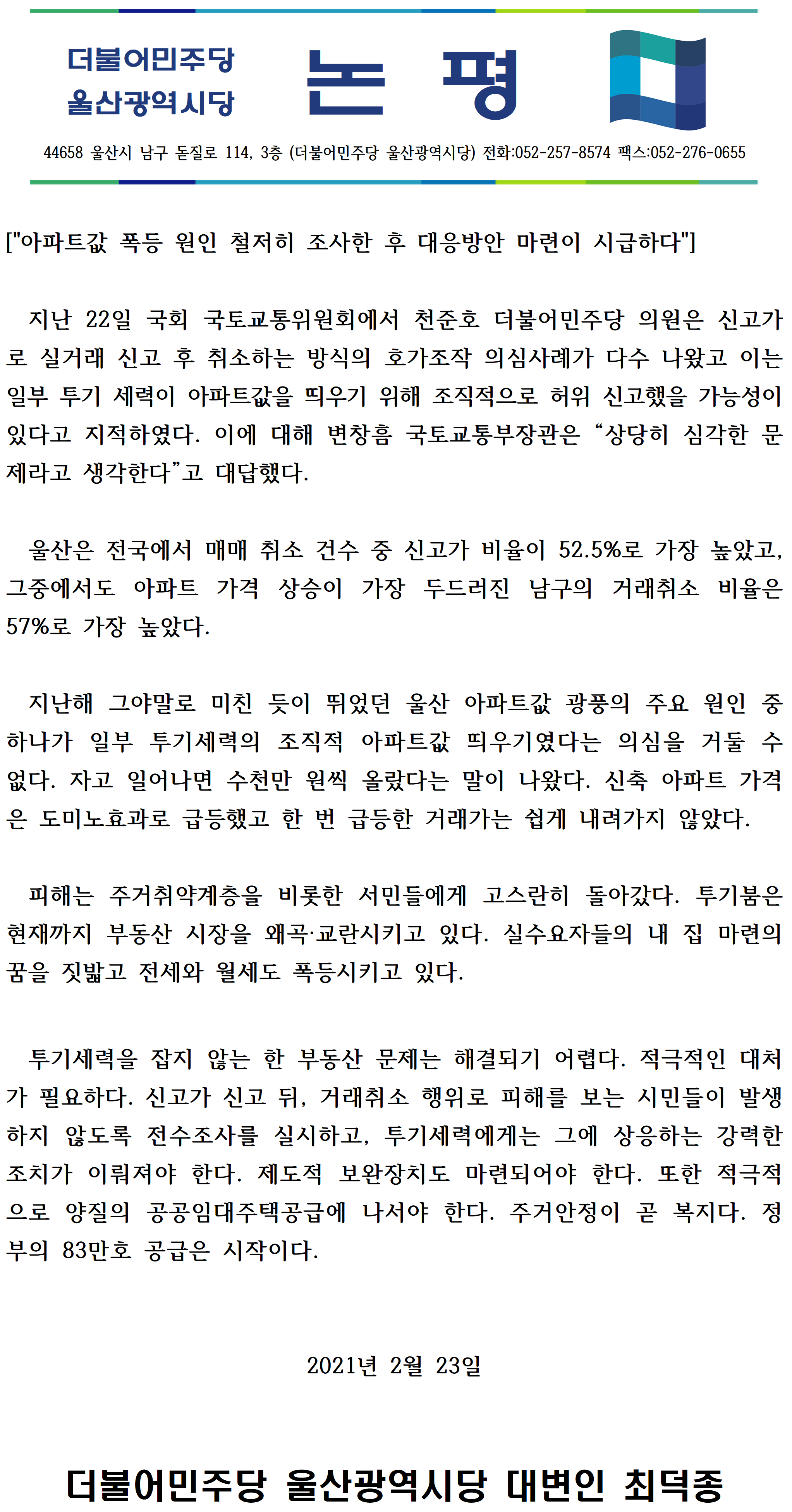 [논평] "아파트값 폭등 원인 철저히 조사한 후 대응방안 마련이 시급하다"-20210223