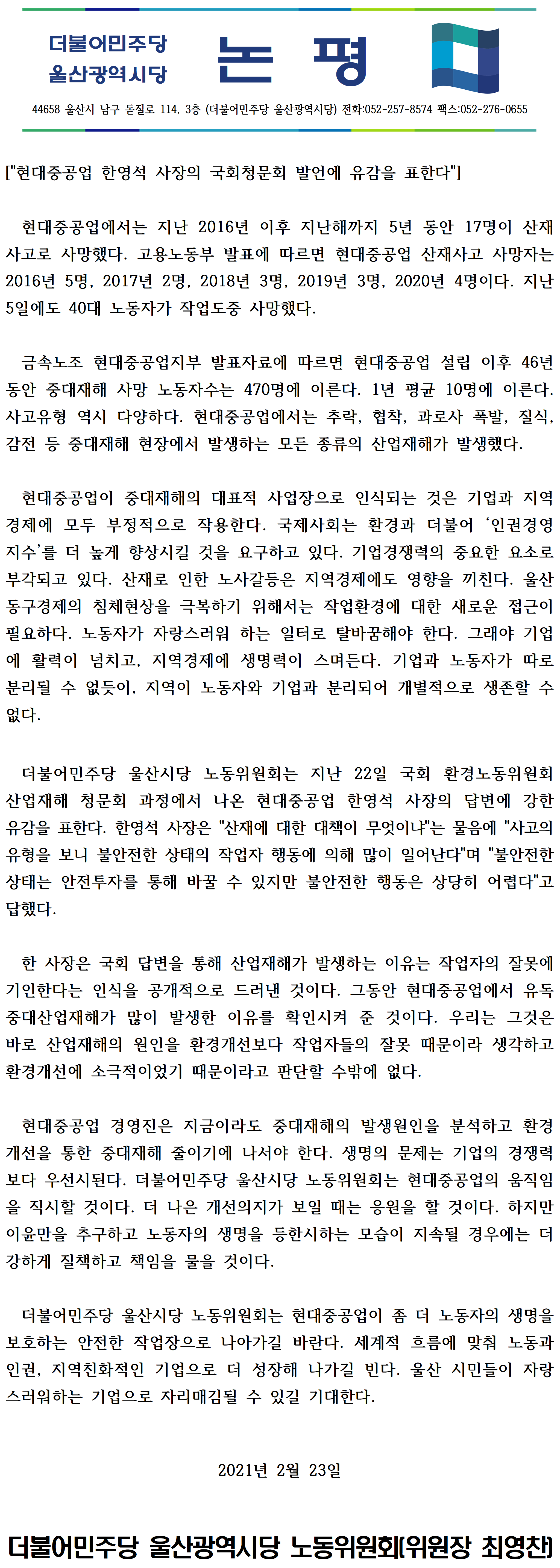 [논평] "현대중공업 한영석 사장의 국회청문회 발언에 유감을 표한다"-20210223