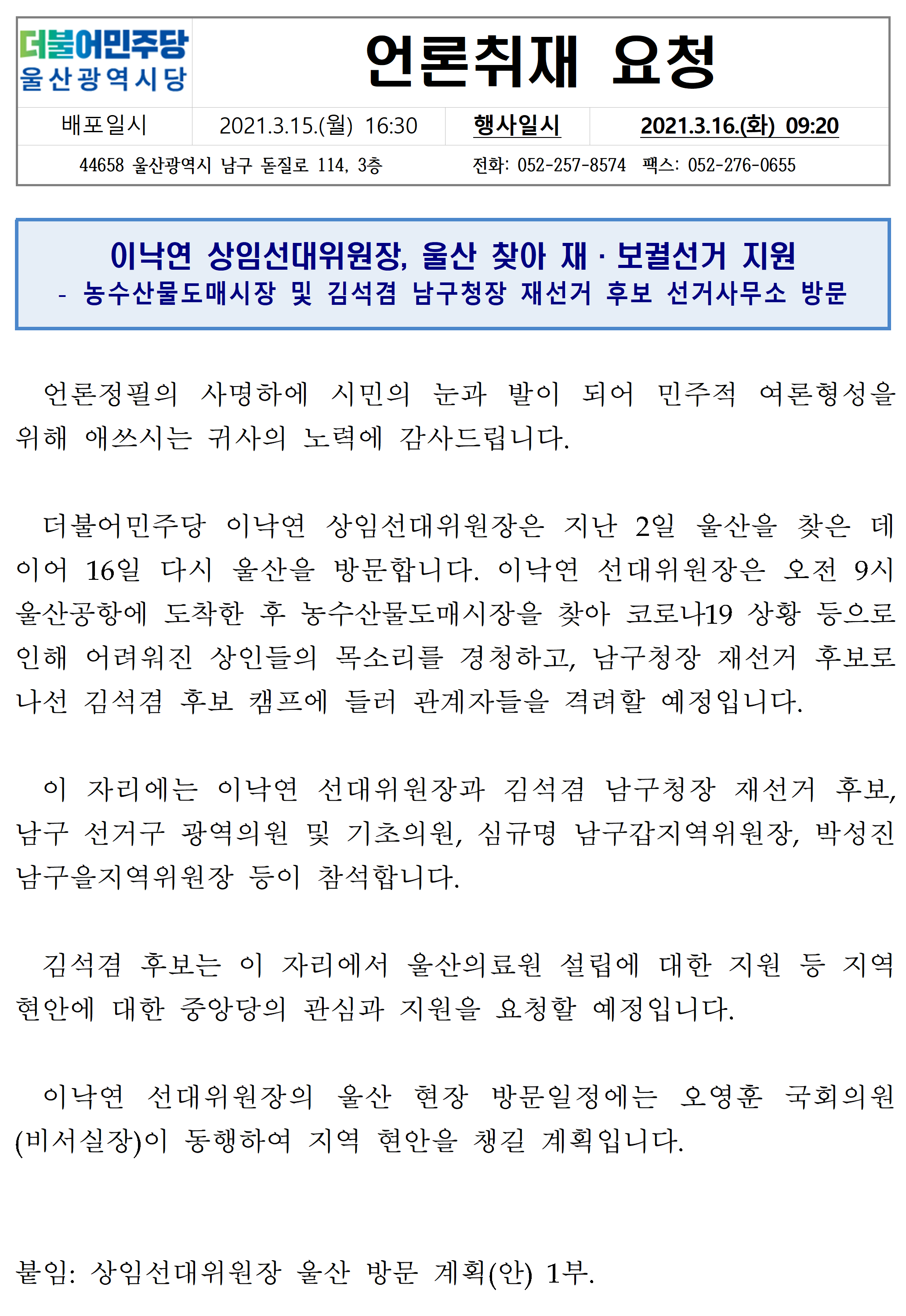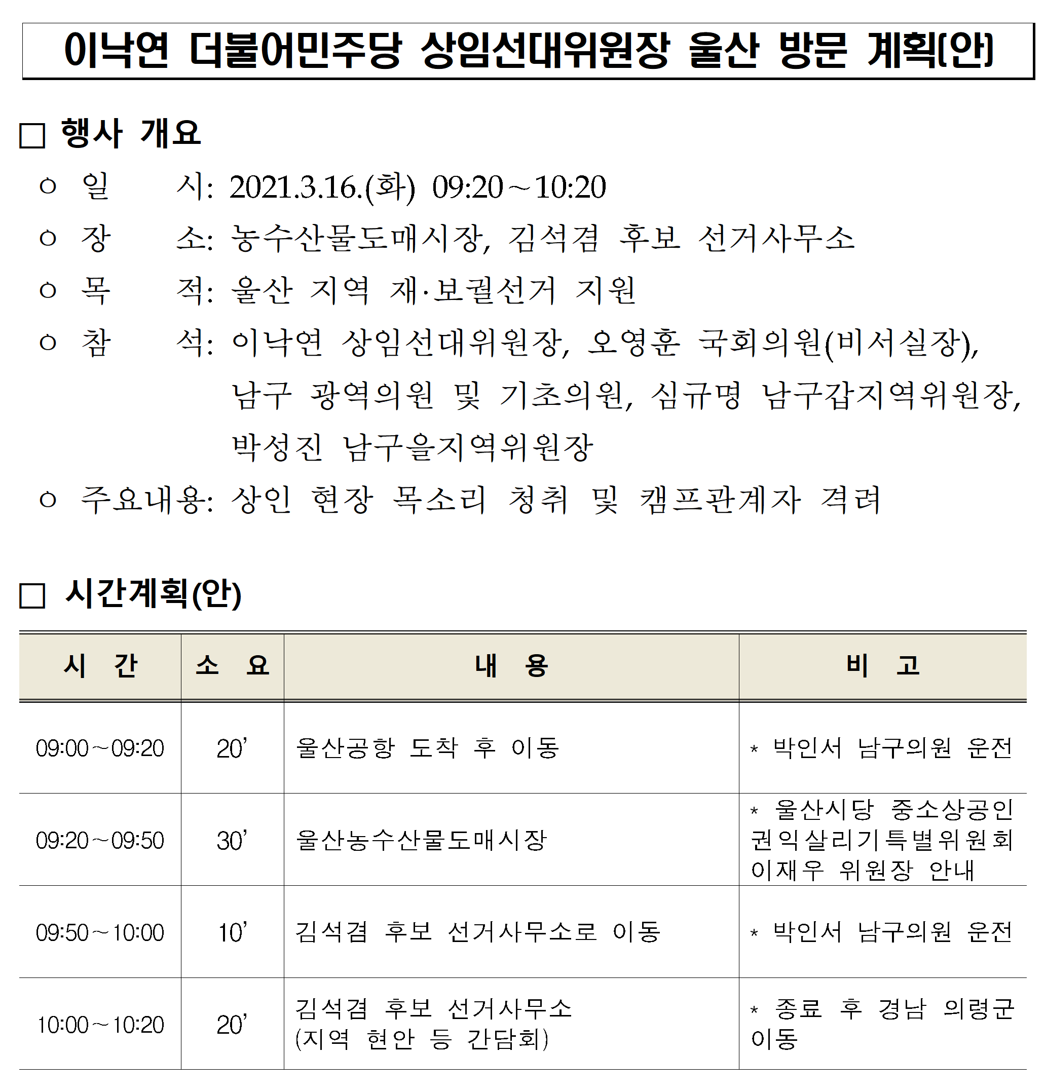 [취재요청] 이낙연 상임선대위원장 울산 방문-20210315