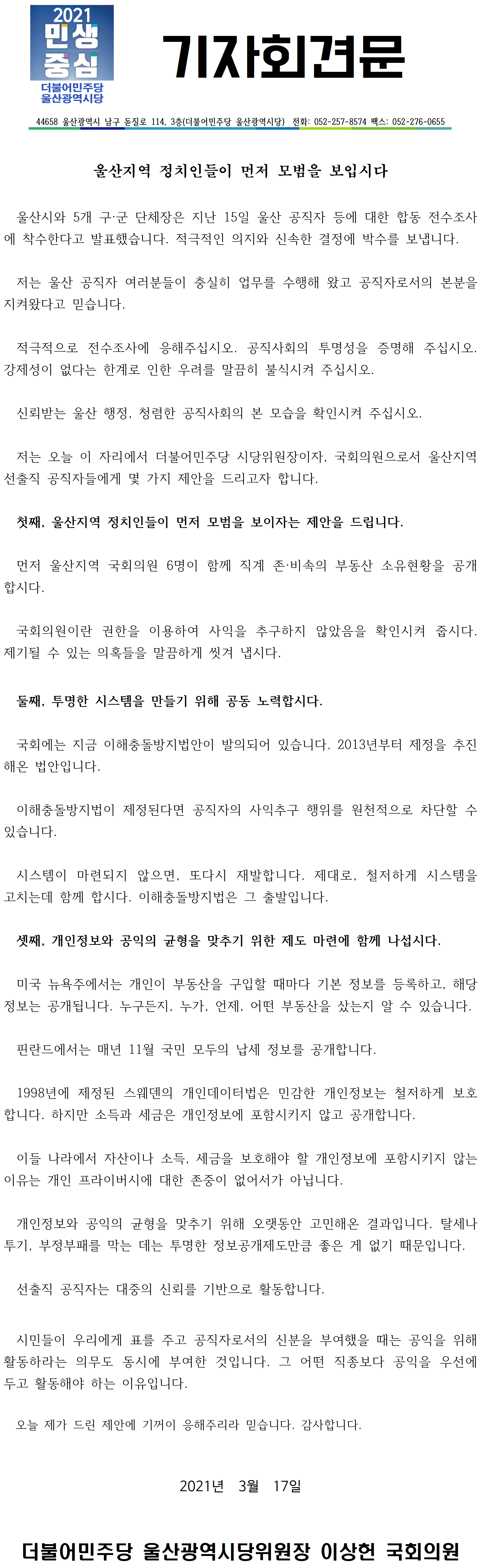 [기자회견] "울산지역 정치인들이 먼저 모범을 보입시다"-20210317