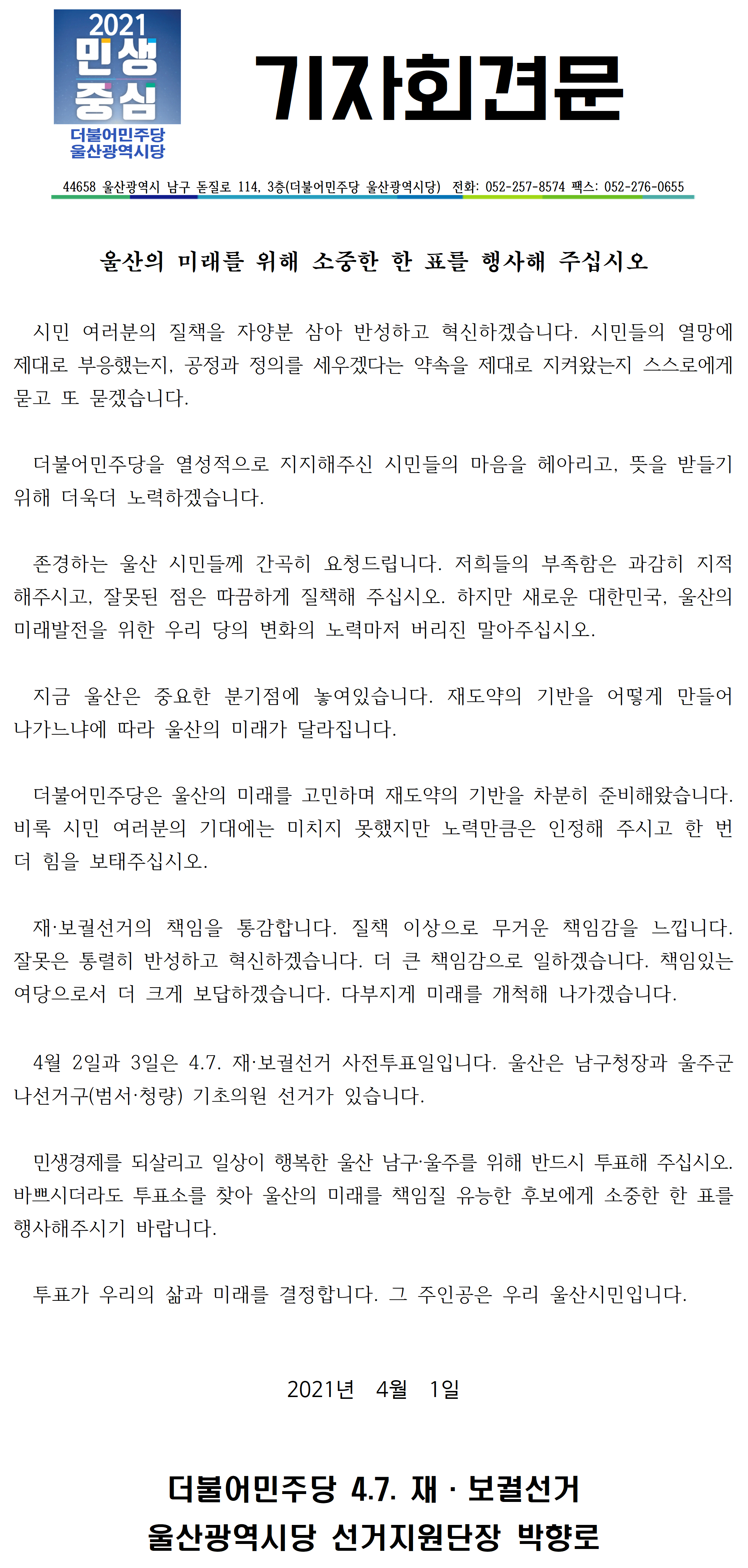 [기자회견] "울산의 미래를 위해 소중한 한 표를 행사해 주십시오"-20210401