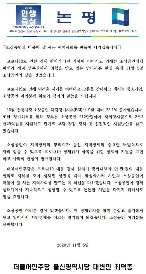 [논평]"소상공인과 더불어 잘 사는 지역사회를 만들어 나가겠습니다"-20201105